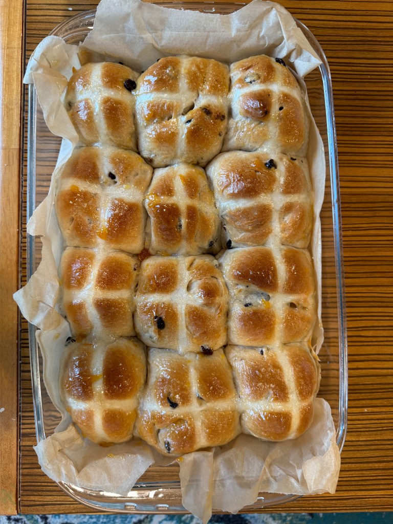 Now it was time to pipe the crosses on the buns and bake! As I piped the crosses I thought of balance and bringing in that energy of light and dark. I popped them into the oven and baked them at 400 for 22 mins.